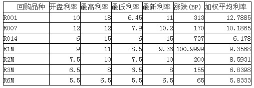 上午銀行間回購利率同樣大幅飆升,截至10:30分,隔夜銀行間質(zhì)押式回購加權(quán)平均利率上漲313基點,至12.7885%;7天銀行間質(zhì)押式回購加權(quán)平均利率上漲170基點,至10.1865%;1個月期銀行間質(zhì)押式回購加權(quán)平均利率上漲101基點,至9.3568%。