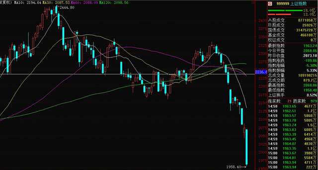 上午兩市低開后,銀行、地產(chǎn)等板塊權(quán)重股下一路下行,11點過后,大盤延續(xù)下探態(tài)勢,其中滬指一度接近2000點重要關(guān)口。午后開盤,被股民譽為代表上證價值的民生銀行跌停,銀行、券商板塊出現(xiàn)大單拋售,滬指隨即失守2000點。14時05分滬指最低跌至1958點,創(chuàng)出本輪調(diào)整以來新低,自2012年12月5日以來滬指再回“1”時代,投資者恐慌情緒極濃,盤中大拋單不斷涌現(xiàn)。