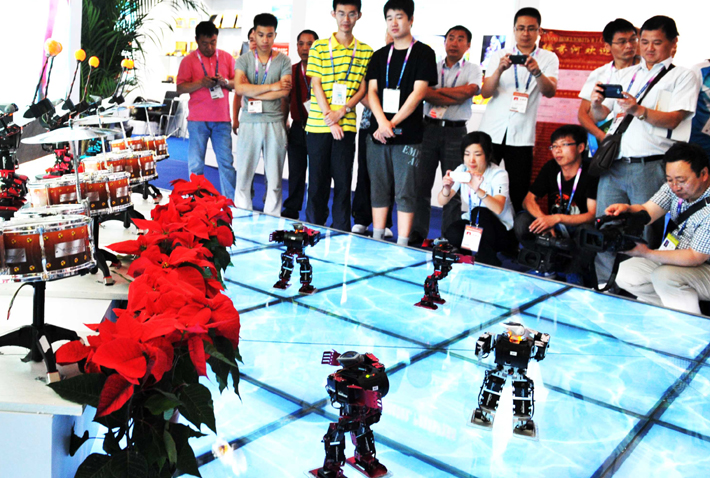 第24屆中國(guó)哈爾濱國(guó)際經(jīng)濟(jì)貿(mào)易洽談會(huì)的高新技術(shù)展區(qū),機(jī)器人舞蹈吸引了參會(huì)者的眼球。哈洽會(huì)是惟一被寫(xiě)入中俄兩國(guó)元首會(huì)晤聯(lián)合公告的展會(huì)。記者王建威/攝 |