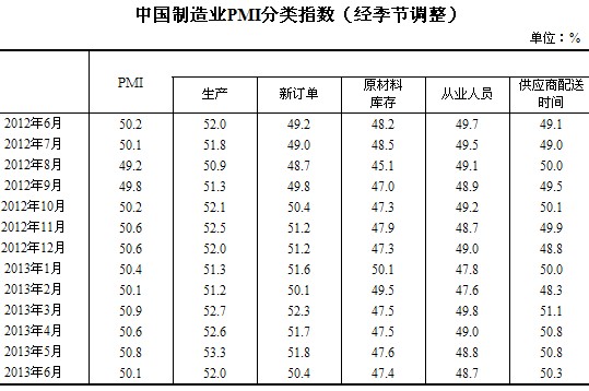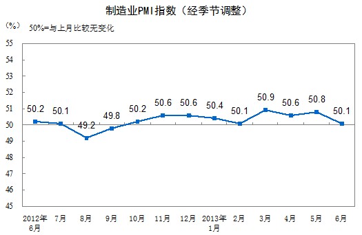 2013年6月,中國(guó)制造業(yè)采購(gòu)經(jīng)理指數(shù)(PMI)為50.1%,比上月回落0.7個(gè)百分點(diǎn)。