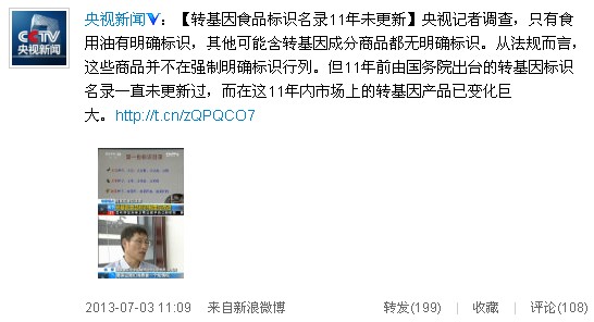 央視記者調(diào)查,只有食用油有明確標(biāo)識(shí),其他可能含轉(zhuǎn)基因成分商品都無明確標(biāo)識(shí)。從法規(guī)而言,這些商品并不在強(qiáng)制明確標(biāo)識(shí)行列。但11年前由國務(wù)院出臺(tái)的轉(zhuǎn)基因標(biāo)識(shí)名錄一直未更新過,而在這11年內(nèi)市場(chǎng)上的轉(zhuǎn)基因產(chǎn)品已變化巨大。