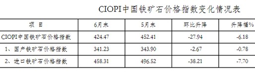 6月末,中國鐵礦石價(jià)格指數(shù)(CIOPI)為424.47點(diǎn),環(huán)比下降27.94點(diǎn),降幅為6.18%,較上月加大了1.07個(gè)百分點(diǎn)。其中:國產(chǎn)鐵礦石價(jià)格指數(shù)為341.23點(diǎn),環(huán)比下降0.78%;進(jìn)口鐵礦石價(jià)格指數(shù)為458.31點(diǎn),環(huán)比下降7.70%,進(jìn)口鐵礦石價(jià)格指數(shù)降幅大于國產(chǎn)鐵礦石。(見下表)