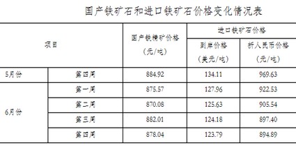 6月末,國產(chǎn)鐵精礦價(jià)格為878.04元/噸,環(huán)比下降6.88元/噸,降幅為0.78%;進(jìn)口鐵礦石(粉礦)到岸價(jià)格為123.79美元/噸,環(huán)比下降10.32美元/噸,降幅為7.70%。折合人民幣價(jià)格為894.89元/噸,環(huán)比下降74.74元/噸,降幅為7.71%。