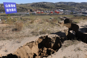 孝義市西辛莊鎮(zhèn)王才堡村東沿洼山因塌陷而形成的裂縫。 |