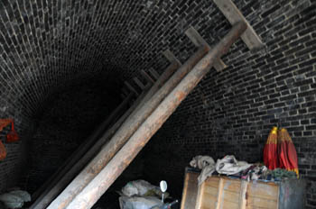 孝義市郝家寨村搬遷后的新房早已裂縫嚴(yán)重。圖為65歲的郝明林家,窯洞裂縫嚴(yán)重,且向下傾斜,為了防止窯洞坍塌,便用碗口粗的木樁子頂著。記者