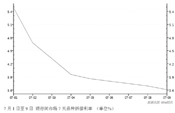 7月以來,6月底的“錢荒”已經(jīng)趨于平穩(wěn),市場也度過了7月5日的補繳存款準(zhǔn)備金的“關(guān)卡”。7月9日,上海銀行間同業(yè)拆放利率(Shibor)顯示,各期限利率全線小幅下跌,短期利率中,隔夜利率下跌0.7個基點,至3.249%;7天期利率下跌6個基點,至3.596%。中長期利率中,3月期利率下跌7.1個基點,至4.723%。