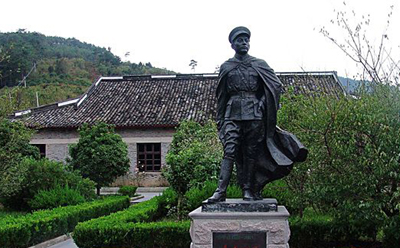 圖中塑像為張學(xué)良將軍,其后房舍原為中旅社雪竇山招待所,1937年月張學(xué)良被蔣幽禁于此。