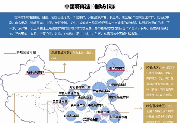 發(fā)改委對城市群的發(fā)展目標是,下一步京津冀、長江三角洲和珠江三角洲城市群將向世界級城市群發(fā)展,另外再打造哈長、呼包鄂榆、太原、寧夏沿黃、江淮、北部灣、黔中、滇中、蘭西、烏昌石等10個區(qū)域性城市群,在這10個城市群中,中西部地區(qū)占據(jù)大半名額。