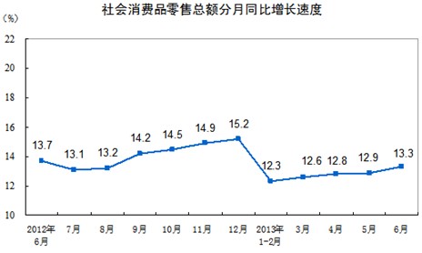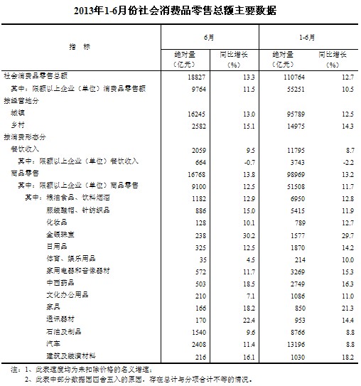 2013年6月份,社會(huì)消費(fèi)品零售總額18827億元,同比名義增長13.3%(扣除價(jià)格因素實(shí)際增長11.7%,以下除特殊說明外均為名義增長)。其中,限額以上企業(yè)(單位)消費(fèi)品零售額9764億元,增長11.5%。1-6月份,社會(huì)消費(fèi)品零售總額110764億元,同比增長12.7%。