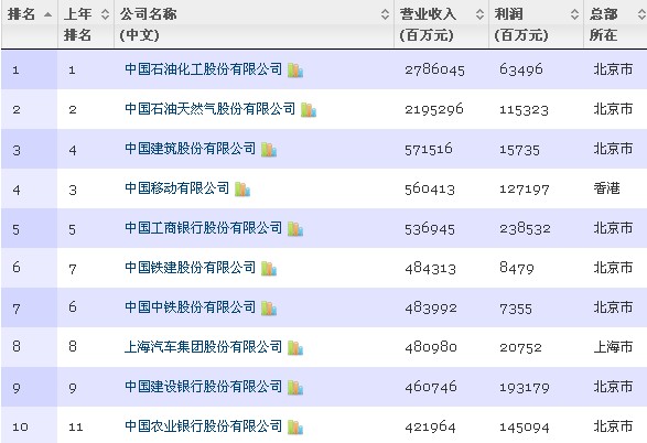 北京時間2013年7月16日,財富中文版正式發(fā)布2013年中國500強(qiáng)排行榜。中石化、中石油分別蟬聯(lián)第一、第二名,中國建筑股份有限公司取代中國移動有限公司成為第三名。今年,中國500強(qiáng)上榜的門檻繼續(xù)提高到72.5億元。四大銀行成為中國500強(qiáng)中最賺錢的公司。