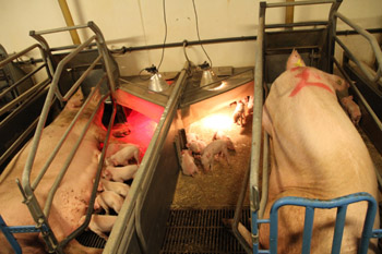養(yǎng)豬場產(chǎn)房里的母豬和剛出生的小豬。楊敬忠 攝 |