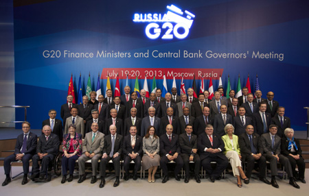 7月20日,出席二十國(guó)集團(tuán)財(cái)政部長(zhǎng)和央行行長(zhǎng)會(huì)議的代表在俄羅斯首都莫斯科馬涅什展覽中心會(huì)場(chǎng)內(nèi)合影。