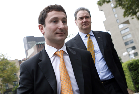 22日,前高盛集團(tuán)交易員法布里·圖雷(左)在律師陪伴下到達(dá)紐約曼哈頓聯(lián)邦法庭,準(zhǔn)備出庭受審。美國證券交易委員會起訴圖雷在2007年高盛發(fā)售的一款合成債務(wù)抵押證券中誤導(dǎo)投資者,遺漏關(guān)鍵信息并對產(chǎn)品作出錯(cuò)誤陳述。被稱為“神奇的法布里”的圖雷在這筆名為Abacus 2007-AC1的金融衍生產(chǎn)品上最后令投資者損失10多億美元。