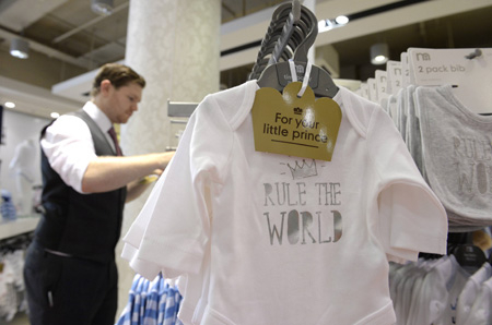 23日,倫敦一家母嬰用品專賣店中,一名店員正在布置英國王室寶寶紀(jì)念品柜臺(tái)。英國零售研究中心預(yù)計(jì),王室寶寶的出生可能為英國經(jīng)濟(jì)新增約2.4億英鎊(約合3.7億美元)產(chǎn)值,因?yàn)橄M(fèi)者會(huì)購買食品和酒水飲料慶祝,與英國王室相關(guān)的紀(jì)念品、玩具、書籍和音像制品銷售也會(huì)有所擴(kuò)大。知名經(jīng)濟(jì)咨詢機(jī)構(gòu)IHS的英國首席經(jīng)濟(jì)學(xué)家霍華德·阿徹表示,王室寶寶的出生或許能給英國經(jīng)濟(jì)帶來短暫、小規(guī)模的正面刺激,提振消費(fèi)者的樂觀情緒。