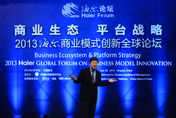 在當(dāng)天舉行的“2013海爾商業(yè)模式創(chuàng)新全球論壇”上,海爾集團(tuán)董事局主席、首席執(zhí)行官張瑞敏就互聯(lián)網(wǎng)時代的企業(yè)管理闡述了他的管理理念。