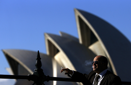 澳大利亞國庫部長克里斯·鮑恩與衛(wèi)生和醫(yī)學研究部長塔尼婭·普利伯塞克1日共同發(fā)表聲明,宣布澳大利亞將在未來4年內(nèi)每年將煙草稅提高12.5%,用于治療與煙草相關(guān)的癌癥,并幫助聯(lián)邦政府重獲財政盈余。 圖為當日一名男子在澳大利亞悉尼歌劇院前抽煙。