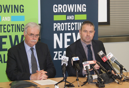 8月7日,新西蘭初級(jí)產(chǎn)業(yè)部負(fù)責(zé)食品安全事務(wù)的代理局長斯科特·加拉赫(右)在新聞吹風(fēng)會(huì)上表示,雖然目前仍然無法排除嬰兒因服用遭污染的配方奶粉而患病的可能性,但新西蘭境內(nèi)已經(jīng)追溯到所有未銷售的可能遭污染的嬰幼兒配方奶粉。