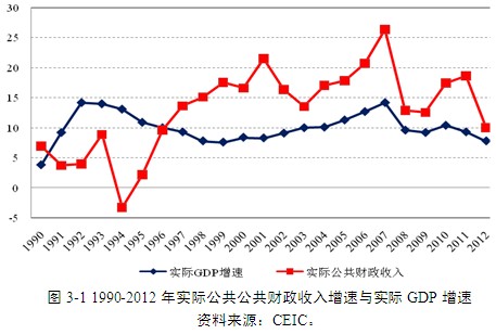 分稅制改革之后,從1997年開始,中國(guó)政府的公共財(cái)政收入迅速增長(zhǎng),1996-2012年,公共財(cái)政收入的年均增長(zhǎng)速度超過(guò)經(jīng)濟(jì)增長(zhǎng)速度6.51個(gè)百分點(diǎn),公共財(cái)政收入占GDP的比重因此迅速上升(圖3-1)。⑽