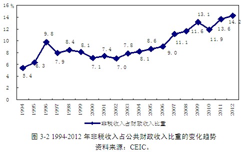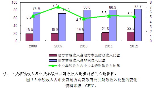 3.進(jìn)一步考察公共財(cái)政收入的構(gòu)成可以發(fā)現(xiàn),自分稅制改革之后,地方各級(jí)政府所能支配的規(guī)范的稅收收入急劇減少。為了滿足自身開支的需要,地方各級(jí)政府熱衷于通過(guò)各種稅外融資方式(目前主要包括非稅收入、政府性基金收入、社會(huì)保險(xiǎn)基金收入和國(guó)有資本經(jīng)營(yíng)收入等)獲取收入。圖3-2表明,1994年分稅制以來(lái),單就公共財(cái)政收入而言,非稅收入在其中所占的比重逐年上升:由1994年的5.4%增長(zhǎng)到2012年的14.2%,提高了8.8個(gè)百分點(diǎn)。圖3-3顯示,2008-2012年期間,在全國(guó)非稅收入中,地方政府約占80%,占地方政府本級(jí)公共財(cái)政收入的20%左右;而中央政府的非稅收入僅為全國(guó)非稅收入的近20%,約占中央政府本級(jí)公共財(cái)政收入的5%。