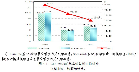 其次,宏觀經(jīng)濟(jì)結(jié)構(gòu)基本保持不變。在模擬的2010-2012年期間,居民消費(fèi)占GDP的比重基本維持不變;固定資產(chǎn)形成總額占GDP比重則小幅上升,分別增加了0.05、0.12和0.18個(gè)百分點(diǎn)(圖3-5)。