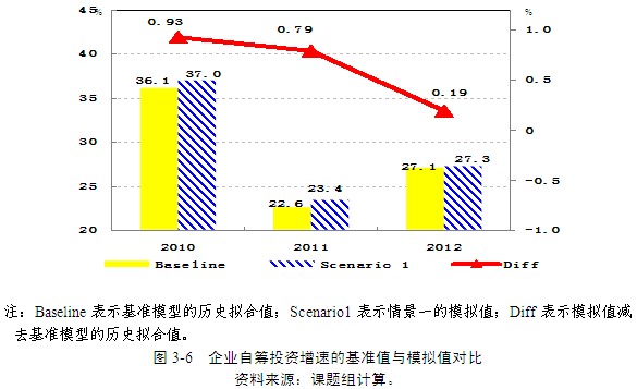 第三,由于減少的非稅收入增加了企業(yè)收入,企業(yè)自籌資金的投資增速相對(duì)基準(zhǔn)模型的歷史擬合值有較大的提高。2010-2012年,企業(yè)自籌資金的投資增速分別提高了0.93、0.79和0.19個(gè)百分點(diǎn)(圖3-6)。