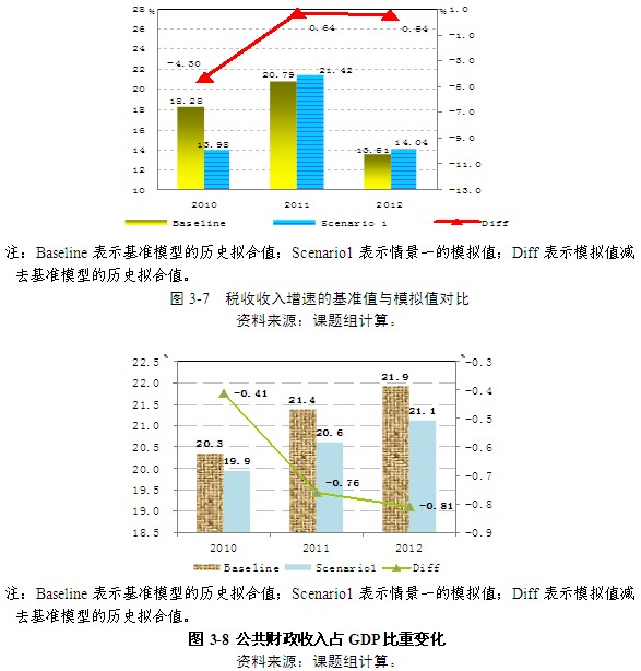 第四,盡管企業(yè)自籌資金投資增速的提高帶動(dòng)了GDP的增長,進(jìn)而帶動(dòng)稅收收入提高,但是,公共財(cái)政收入的增速變化則有所差異。2010-2012年期間,稅收收入增速較基準(zhǔn)模型的歷史擬合值分別變化了-4.63、0.64和0.54個(gè)百分點(diǎn),呈現(xiàn)出先下降后上升的趨勢(shì);公共財(cái)政收入增速分別較基準(zhǔn)模型的歷史擬合值下降了2.33、1.97和0.26個(gè)百分點(diǎn)(圖3-7)。公共財(cái)政收入占GDP的比重變?yōu)?9.9%、20.6%、21.1%,分別比基準(zhǔn)模型的歷史擬合值下降了0.41、0.76、0.81個(gè)百分點(diǎn)(圖3-8)。
