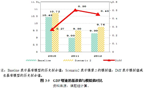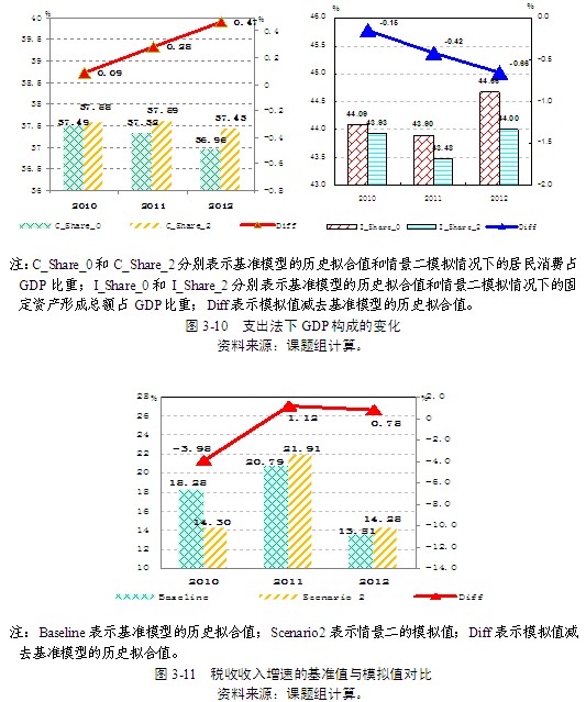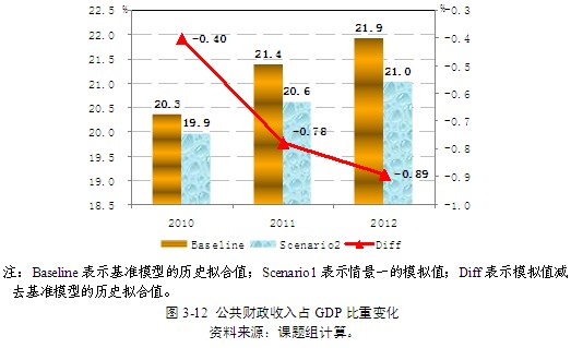 第三,得益于居民消費(fèi)需求的擴(kuò)大以及經(jīng)濟(jì)增長的加快,企業(yè)自籌投資增速相較基準(zhǔn)模擬水平也有所提高。同時(shí),稅收收入增速也逐漸加快。與基準(zhǔn)模型的歷史擬合值相比,在2010-2012年期間,稅收收入增速先降低3.98百分點(diǎn),之后提高1.12、0.78個(gè)百分點(diǎn)(圖3-11)。財(cái)政總收入占GDP的比重分別下降0.4、0.78和0.89個(gè)百分點(diǎn)(圖3-12)。