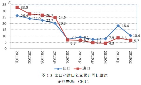 2013年上半年主要經(jīng)濟(jì)體需求疲軟、人民幣持續(xù)升值以及工資的提高導(dǎo)致中國進(jìn)出口增長乏力。上半年按美元計的出口總額增長10.4%,僅比上年同期增加了1.3個百分點(diǎn);進(jìn)口總額增長6.7%,與上年同期持平(圖1-3)。貿(mào)易順差累計1079.5億美元,同比增加了57.4%。上半年實(shí)際利用外商直接投資增長4.8%,比上年同期上升了7.8個百分點(diǎn);新增外匯儲備為1851億美元。