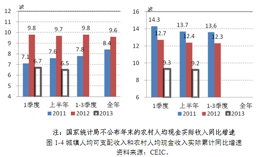 2013年上半年,城鎮(zhèn)居民人均可支配收入為13649元,扣除價格變化后實(shí)際增長6.5%,低于同期的經(jīng)濟(jì)增長率;比2011年同期下降了1.1個百分點(diǎn),比2012年同期下降了3.2個百分點(diǎn)。上半年農(nóng)村人均現(xiàn)金收入4817元,扣除價格變化后實(shí)際增長9.2%;比2011年同期下降了4.5個百分點(diǎn),比2012年同期下降3.2個百分點(diǎn)(圖1-4)。城鄉(xiāng)居民實(shí)際收入增速的大幅下滑從根本上抑制了居民消費(fèi)需求擴(kuò)張。