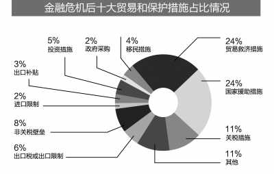 如圖所示,自2008年11月至今,國家援助措施和政府采購已經占全部貿易保護措施的26%,成為最重要的保護手段之一。而以往貿易保護措施中最常使用的手段是關稅和非關稅措施,目前所占的比重已經不足1/5。