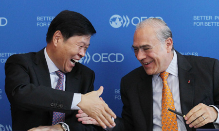 8月27日,在位于法國巴黎的經(jīng)濟(jì)合作與發(fā)展組織(經(jīng)合組織)總部,中國國家稅務(wù)總局局長王軍代表中國政府簽署《多邊稅收征管互助公約》,中國由此成為該公約第56個簽約方,為加強(qiáng)國際稅收合作、擴(kuò)大國際稅收征收網(wǎng)絡(luò)和提高對跨境納稅人的稅收征管與服務(wù)水平邁出堅實一步。 圖為王軍(左)與經(jīng)合組織秘書長安赫爾·古里亞在簽約儀式上握手。