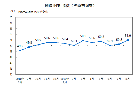 2013年8月,中國制造業(yè)采購經(jīng)理指數(shù)(PMI)為51.0%,比上月上升0.7個百分點(diǎn),連續(xù)11個月位于臨界點(diǎn)以上。