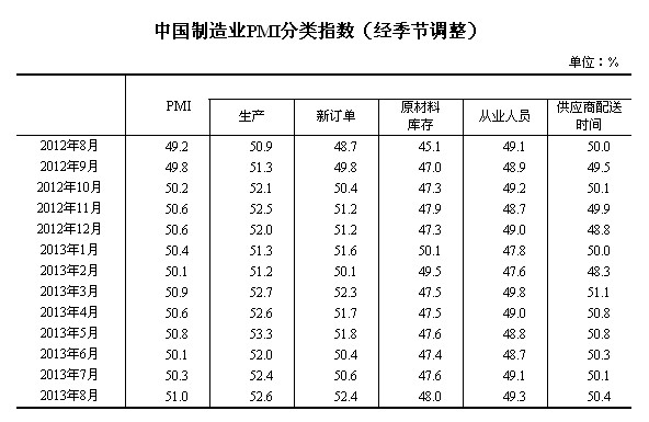 2013年8月,構(gòu)成制造業(yè)PMI的5個分類指數(shù)普遍上升。