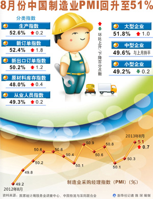 中國物流與采購聯(lián)合會、國家統(tǒng)計局服務(wù)業(yè)調(diào)查中心9月1日發(fā)布,2013年8月份中國制造業(yè)采購經(jīng)理指數(shù)(PMI)為51%,比上月上升0.7個百分點,連續(xù)第11個月擴張并創(chuàng)下年內(nèi)新高。