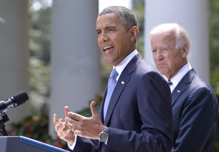 圖為8月31日美國總統(tǒng)奧巴馬在副總統(tǒng)拜登陪同下,在白宮玫瑰花園就敘利亞問題發(fā)表聲明。