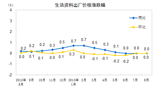 2013年8月份,全國工業(yè)生產(chǎn)者出廠價格同比下降1.6%,環(huán)比上漲0.1%。工業(yè)生產(chǎn)者購進(jìn)價格同比下降1.6%,環(huán)比上漲0.1%。1-8月平均,工業(yè)生產(chǎn)者出廠價格同比下降2.2%,工業(yè)生產(chǎn)者購進(jìn)價格同比下降2.3%。