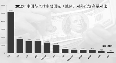 據(jù)統(tǒng)計,截至2012年底,中國對外直接投資累計凈額(存量)達5319.4億美元,位居全球第13位。