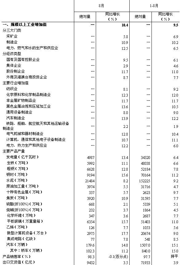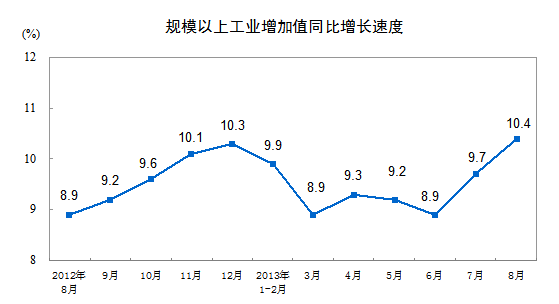 國(guó)家統(tǒng)計(jì)局10日公布數(shù)據(jù),2013年8月份,規(guī)模以上工業(yè)增加值同比實(shí)際增長(zhǎng)10.4%(以下增加值增速均為扣除價(jià)格因素的實(shí)際增長(zhǎng)率),比7月份加快0.7個(gè)百分點(diǎn)。從環(huán)比看,8月份,規(guī)模以上工業(yè)增加值比上月增長(zhǎng)0.93%。1-8月,規(guī)模以上工業(yè)增加值同比增長(zhǎng)9.5%。