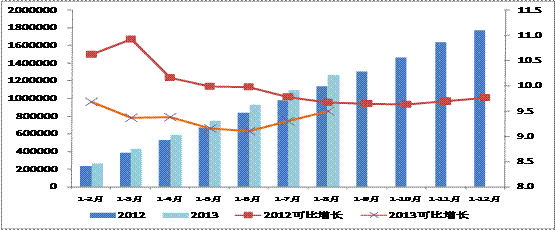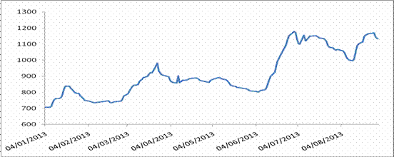 8月份,中國物流業(yè)景氣指數中,物流服務價格指數環(huán)比回升2.6個百分點,回升至50.6%,5月份以來首次回升到50%以上。從海運市場看,受上海自貿區(qū)立項、宏觀經濟數據逐漸向好、投資者信心有所回升等因素帶動,中國沿海散貨運價指數平均為1009.4點,環(huán)比上漲4.3%。1-8月綜合指數平均為1029.1點,同比下降7.7%,降幅較1-7月收窄0.2個百分點。