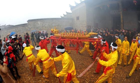 每年大年初一夜開始喊船值夜活動,每晚必喊,一直要鬧到正月三十下元宵。請大神是全族性的祭神活動,一切由神頭主持。神頭的產(chǎn)生由宗族確定。村中安排以房族為單位,輪流值班,當值的人家在新年前就要備好各種“喊船”時需要的東西,其中主要是鞭炮、香燭、紙錢、香油、果品等!按笊瘛逼鋵嵤且粡埓,請大神時,由道士按法事程序辦,從右耳房請出,懸掛在耳房門前右山墻上,下置祭臺香案。傍晚掌燈時分,輪值的男丁老幼,