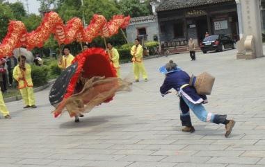 (四)到達(dá)陂頭“義倉(cāng)”廟前,駐步祭神。護(hù)架的執(zhí)事人焚香祝愿,神銃再響,鑼鼓齊奏,族長(zhǎng)三叩九禮,接過(guò)“神筒”,邊滾錫筒邊大聲唱贊:“一柱擎天,政通人和;二龍戲珠,人臻五福;三陽(yáng)開(kāi)泰,吉星高照;四季發(fā)財(cái),物阜民豐;五子登科,鵬程萬(wàn)里;六六大順,心想事成;七星拱照,瑞氣祥云;八方進(jìn)寶,財(cái)源滾滾;九九歸一,華夏生輝;十全十美,地久天長(zhǎng)!辟澰~在音樂(lè)聲中念畢,炮聲震地。鼓樂(lè)齊奏、煙霧彌空,嗩吶長(zhǎng)鳴,歡慶著新年五谷豐登,國(guó)泰民安。