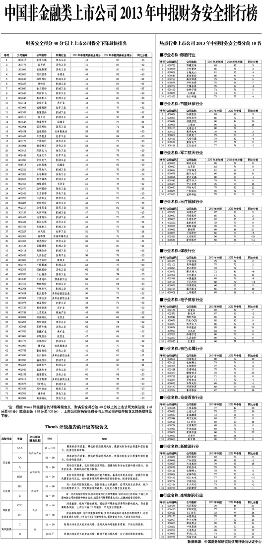中國非金融類上市公司2013年中報(bào)財(cái)務(wù)安全排行榜