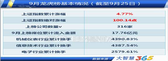 據(jù)大智慧統(tǒng)計(jì)數(shù)據(jù)顯示,截至9月25日,龍虎榜的上榜家數(shù)共有316家,資金凈流入17.76億元。表現(xiàn)最為活躍的3個(gè)行業(yè)仍然是機(jī)械儀表行業(yè)、信息技術(shù)行業(yè)和電子行業(yè),累計(jì)換手率分別達(dá)到了4390.83%、4387.54%以及2579.61%。這3個(gè)行業(yè)在7月和8月龍虎榜中也是表現(xiàn)最為活躍,涌現(xiàn)出多只漲勢凌厲的個(gè)股。在最活躍的機(jī)械儀表行業(yè)里面,換手率排名靠前的個(gè)股分別是戴維醫(yī)療(282.45%)、三維絲(238.51%)、桑樂金(214.03%)、博林特(203.85%)和江蘇宏寶(194.74%)。這幾只股票在9月都取得了不錯(cuò)的漲幅。