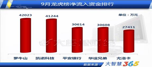 9月龍虎榜中,資金凈流入的前5個(gè)股分別是羅牛山、凱諾科技、平安銀行、華誼兄弟以及尤洛卡。在機(jī)構(gòu)及游資的追捧下,這五只個(gè)股也表現(xiàn)不俗。其中羅牛山是土改概念股,華誼兄弟是文化傳媒股。十八屆三中全會(huì)上極有可能出臺(tái)土改政策利好,而文化傳媒板塊既有政策扶持,又有優(yōu)秀的業(yè)績支撐,這兩個(gè)板塊成為資金追逐的熱點(diǎn)在情理之中。凱諾科技為重組概念,重組概念股一貫就是市場青睞的對(duì)象。