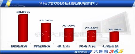 9月龍虎榜股票漲幅排行榜也驗(yàn)證了這一點(diǎn)。以88.89%的漲幅排名第一的銀潤投資為重組概念股,漲幅第2的輝隆股份和漲幅第4的天舟文化,為土改概念股和文化傳媒股。大智慧投資顧問余磊表示,在經(jīng)過暑期檔多部電影創(chuàng)下過億票房后,文化傳媒股的三季報(bào)或能有優(yōu)異表現(xiàn),屆時(shí)或又將迎來一番炒作。