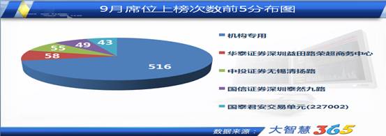9月龍虎榜中最活躍的5家席位分別是機(jī)構(gòu)專用席位、華泰證券深圳益田路榮超商務(wù)中心、中投證券無錫清揚(yáng)路營業(yè)部、國信證券深圳泰然九路營業(yè)部和國泰君安交易單元(227002)。機(jī)構(gòu)專用席位共上榜了516次,華泰證券深圳益田路榮超商務(wù)中心營業(yè)部上榜58次,中投無錫清揚(yáng)路營業(yè)部上榜55次,國信證券深圳泰然九路營業(yè)部上榜49次,國泰君安交易單元(227002)上榜43次。在8月的龍虎榜中,中投無錫清揚(yáng)路營業(yè)部、機(jī)構(gòu)專用席位也登上了上榜次數(shù)前5排名。大智慧投資顧問余磊表示,投資者可以重點(diǎn)跟蹤這幾家席位的買賣情況。