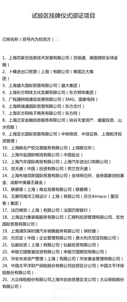 中國(guó)(上海)自由貿(mào)易試驗(yàn)區(qū)9月29日上午10:15分正式掛牌,上海百家合信息技術(shù)發(fā)展有限公司、東方明珠集團(tuán)、上海聯(lián)交所等首批25家企業(yè)入駐自貿(mào)區(qū)。