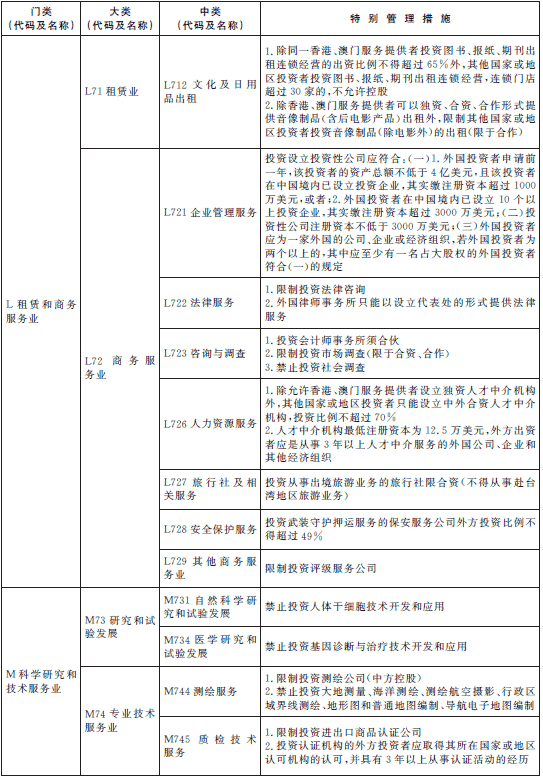 除列明的外商投資準(zhǔn)入特別管理措施,禁止(限制)外商投資國家以及中國締結(jié)或者參加的國際條約規(guī)定禁止(限制)的產(chǎn)業(yè),禁止外商投資危害國家安全和社會安全的項(xiàng)目,禁止從事?lián)p害社會公共利益的經(jīng)營活動(dòng)。