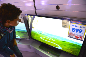 一位意大利消費者正在關(guān)注海爾智能電視。 王星橋/攝 |
