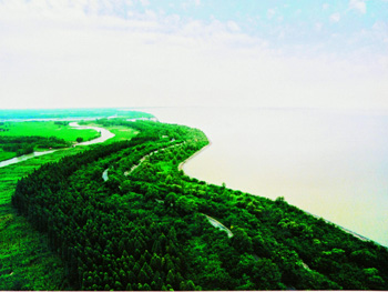 自明萬歷八年(公元1580年)起,洪澤湖大堤的迎水坡開始增筑直立式條石墻護(hù)面,時稱“石工墻”,歷經(jīng)明清兩代171年形成規(guī)模!笆Α庇们Ы镏氐臈l石及糯米石灰漿砌筑,共用條石6萬多塊,規(guī)格統(tǒng)一,筑工精細(xì),充分展示了我國古代水利建設(shè)的高超技藝。現(xiàn)如今,洪澤湖大堤已被納入江蘇省申報世界文化遺產(chǎn)的推薦名單之中。大堤兩側(cè)遍植樹木,宛如游移欲飛的巨龍依水而臥。人行其中,倍覺“浩渺云煙籠細(xì)浪,空蒙雨色入重淵”。
